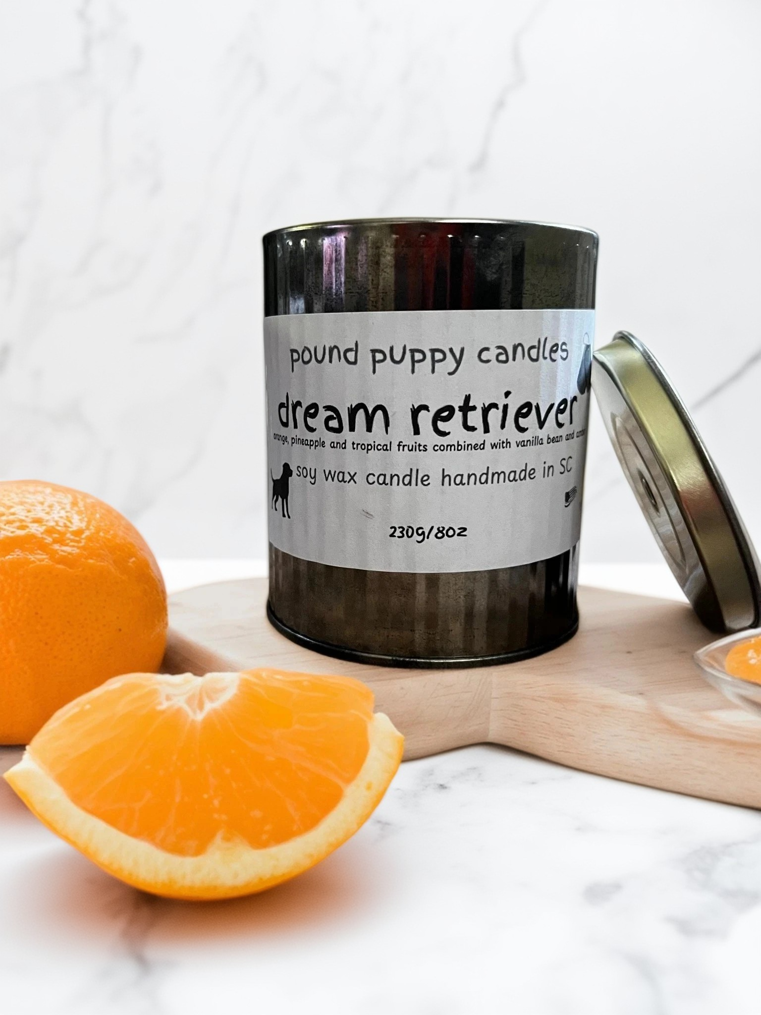 Introducing "Dream Retriever". Cool up your space with the scents of orange, pineapple, and tropical fruits mixed with notes of vanilla bean, cream, and amber, right off the ice-cream truck.